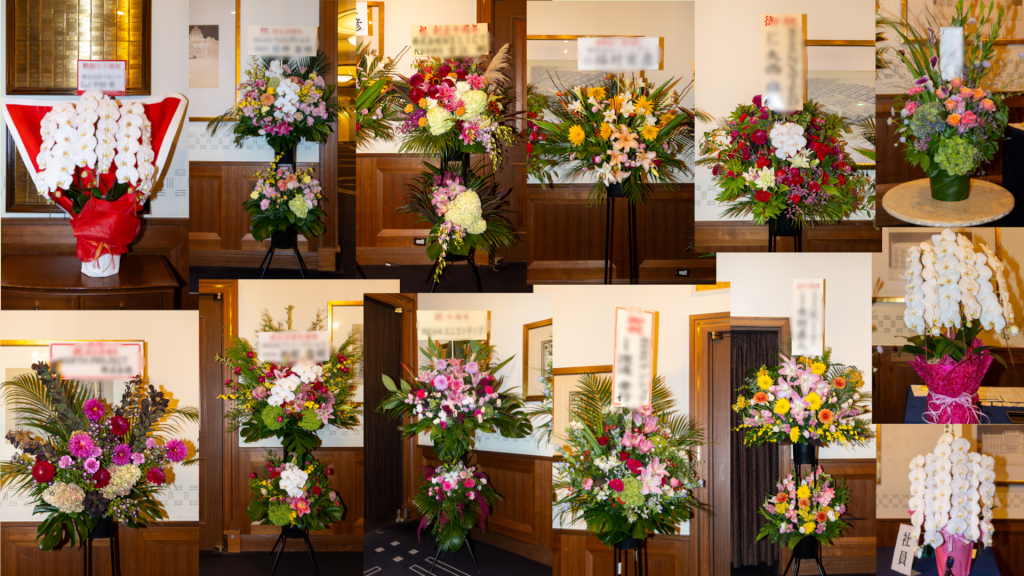 会場の入り口前には、皆様から頂いたお花がたくさん飾られていました。